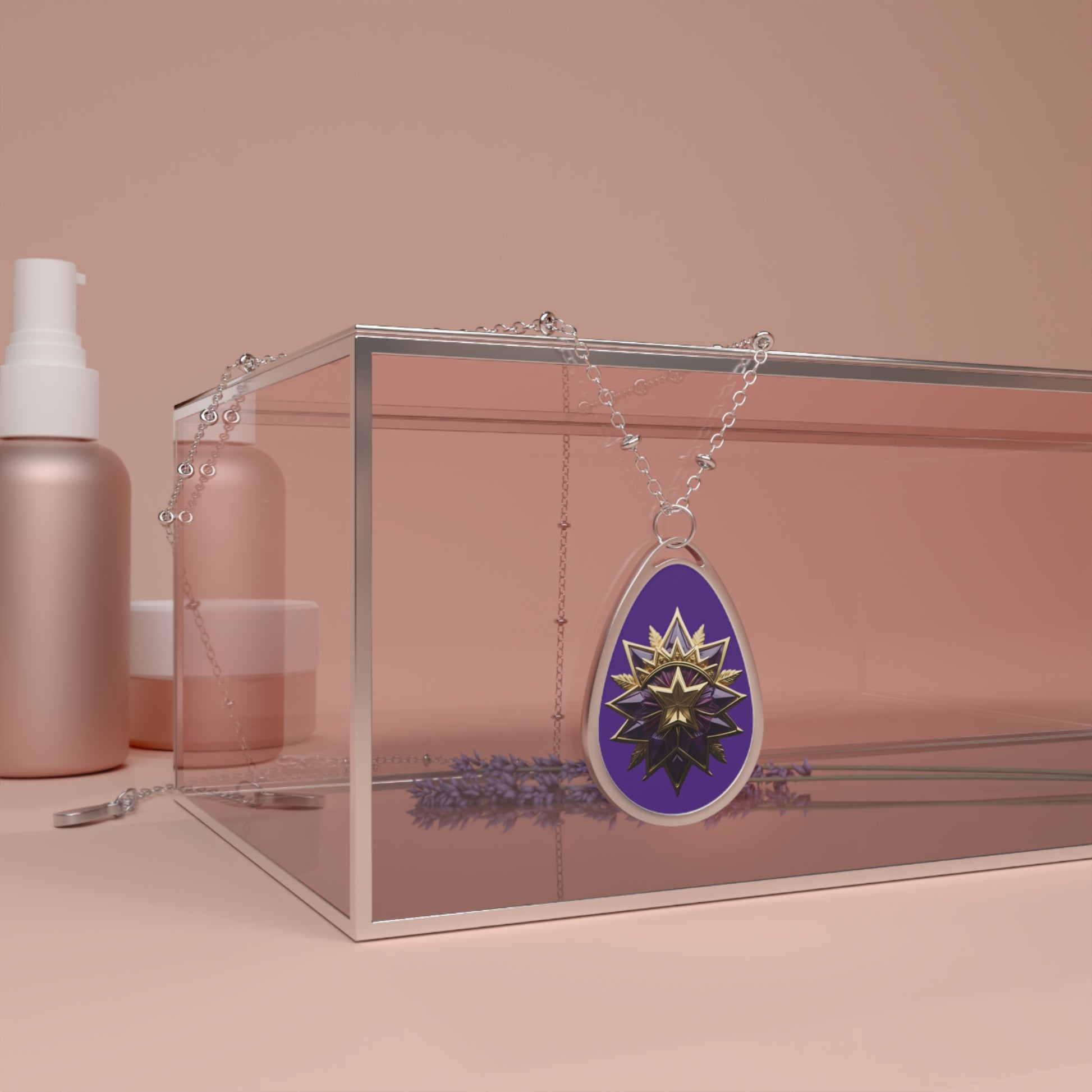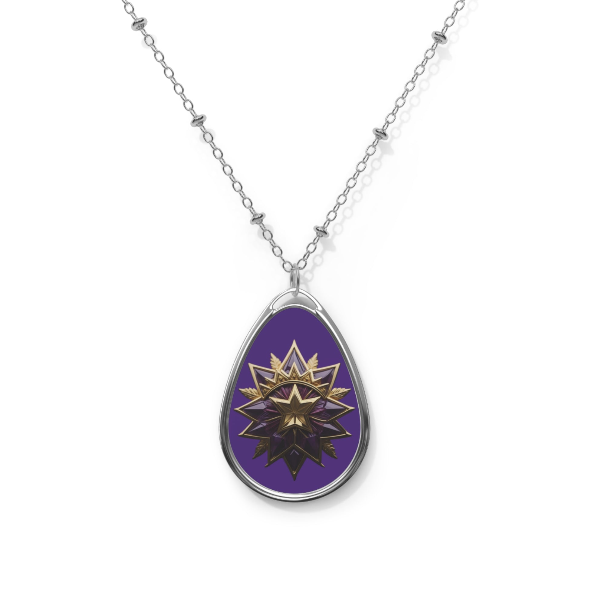 A luminous oval pendant that feels like a tiny talisman. The glossy, full‑color surface captures rich purples and a metallic sunburst motif that catches light and attention. Lightweight zinc alloy framing and a smooth white aluminum print plate keep the design crisp while the delicate chain with small bead accents adds a handcrafted, slightly vintage edge. It settles close to the collarbone, layering easily with other pieces or standing alone as a signature accent — the kind of necklace you reach for when you want to carry a little mystery and warmth through the day.